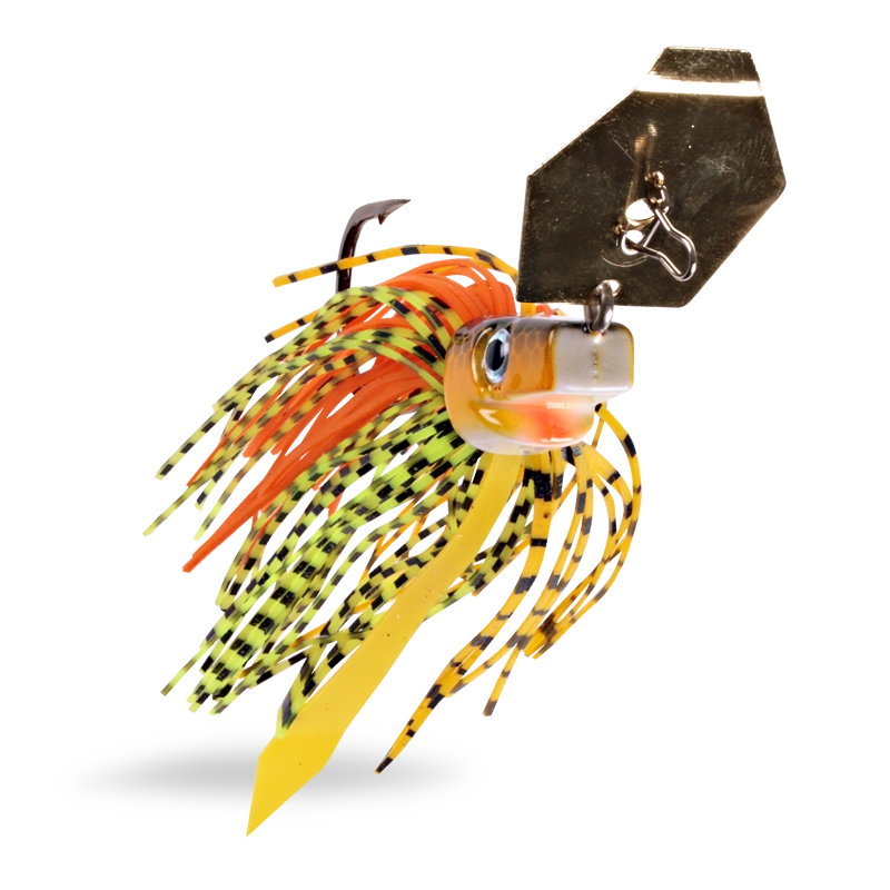 Pig Hula is a bladed jig from Catch with Care. Built on the classic set up of a traditional chatter bait, the Pig Hula attracts the eye of the big perch angler! Standardized sizes of head and blade with a 4/0 hook aims for a choice of lure that runs with a powerful action and attraction. The Pig Hula is ideal for any water type to run through weeds or above solid bottom vegeta- tion. Wire lure keeper on the hook helps fixation of the trailer of your choosing. The head of the Pig Hula is colored and coated for additional attraction to the skirts of the bladed jig. Available in 11g, 16g and 21g.